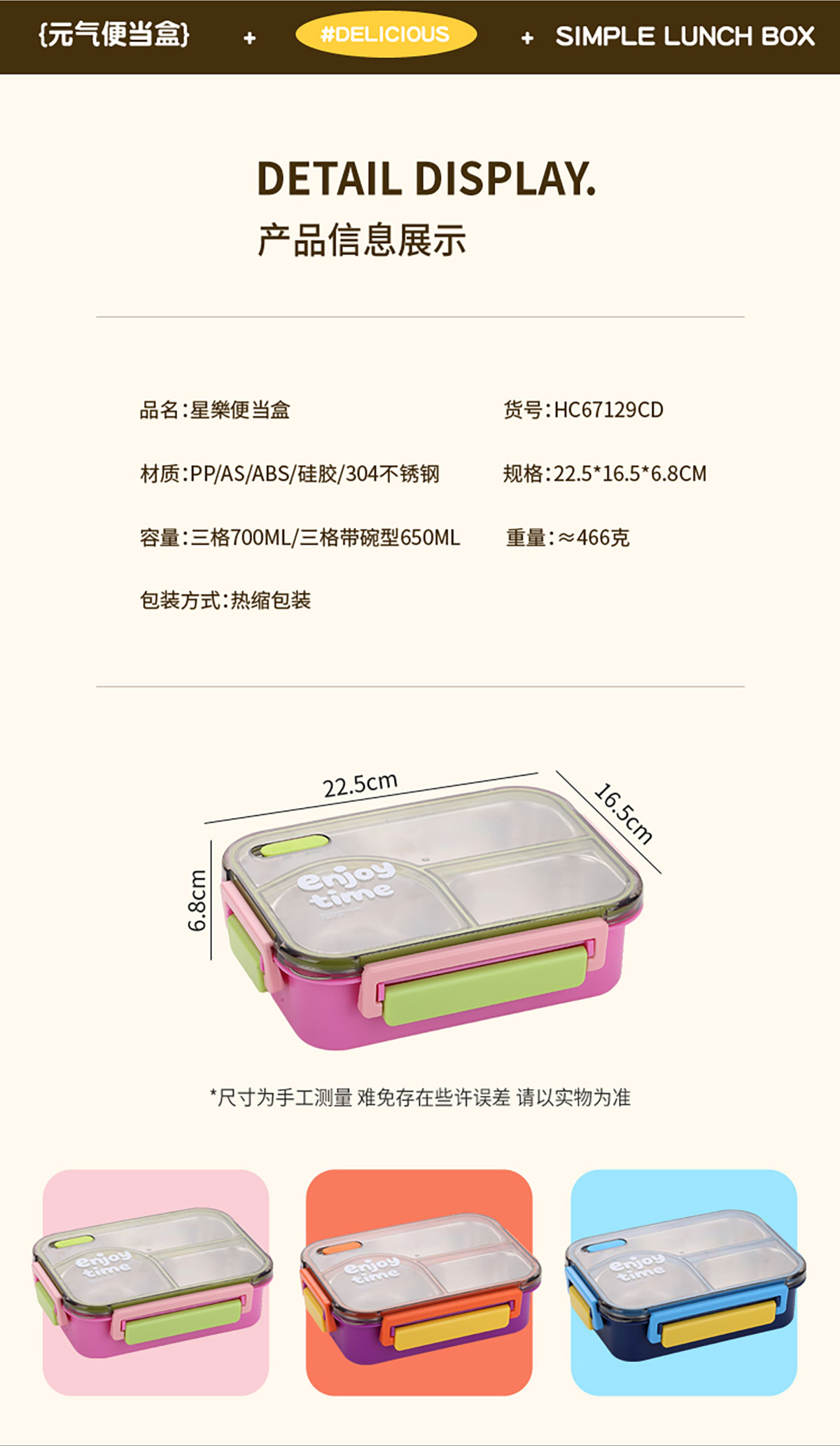 Size: 225*165*68mm/三格700ml/三格带碗650ml