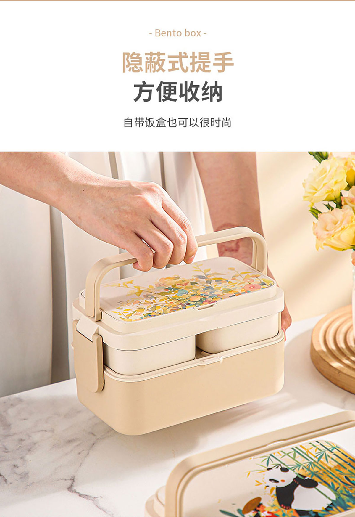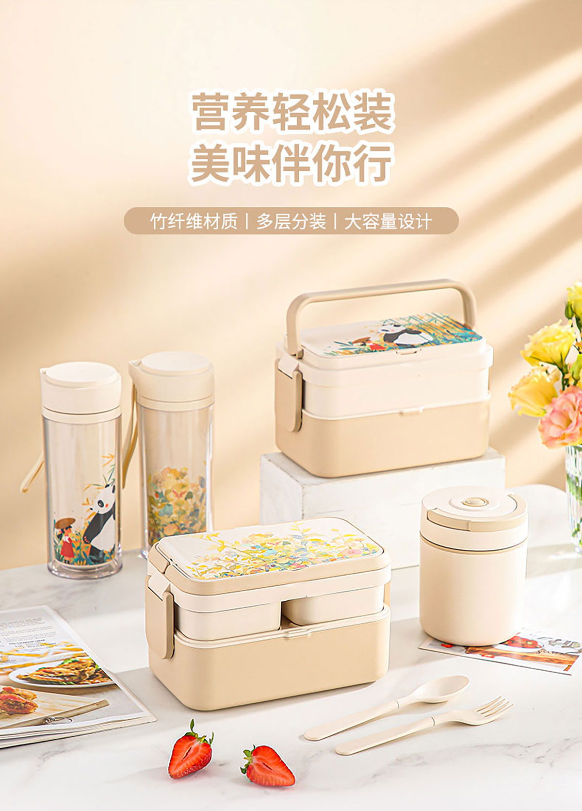 纤竹米吉二合一/三合一双层饭盒/双层悦欣杯/汤杯 米白清装