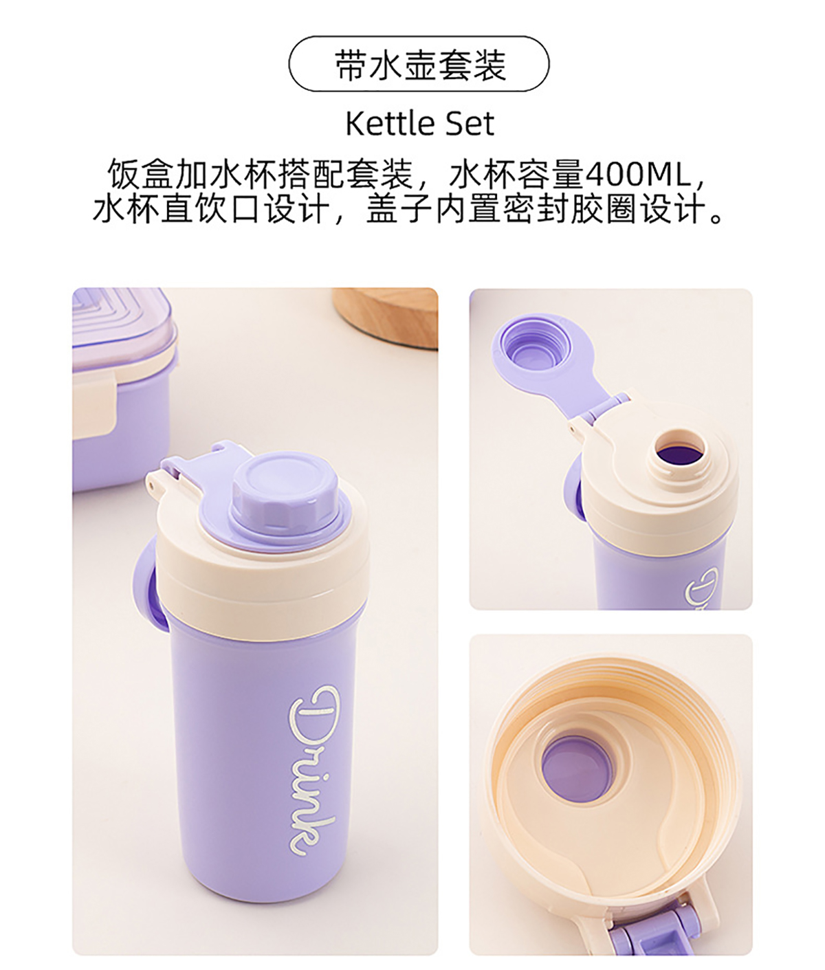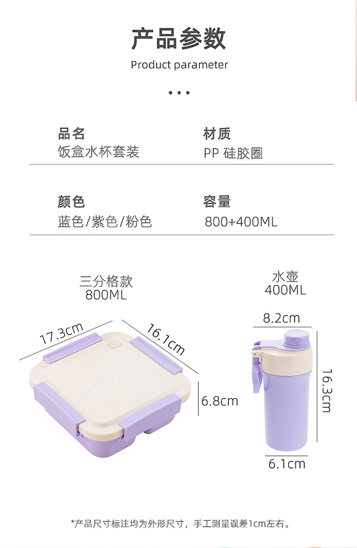 Size: 饭盒:173*161*68mm/800ml 水壶:φ82*61*163mm/400ml