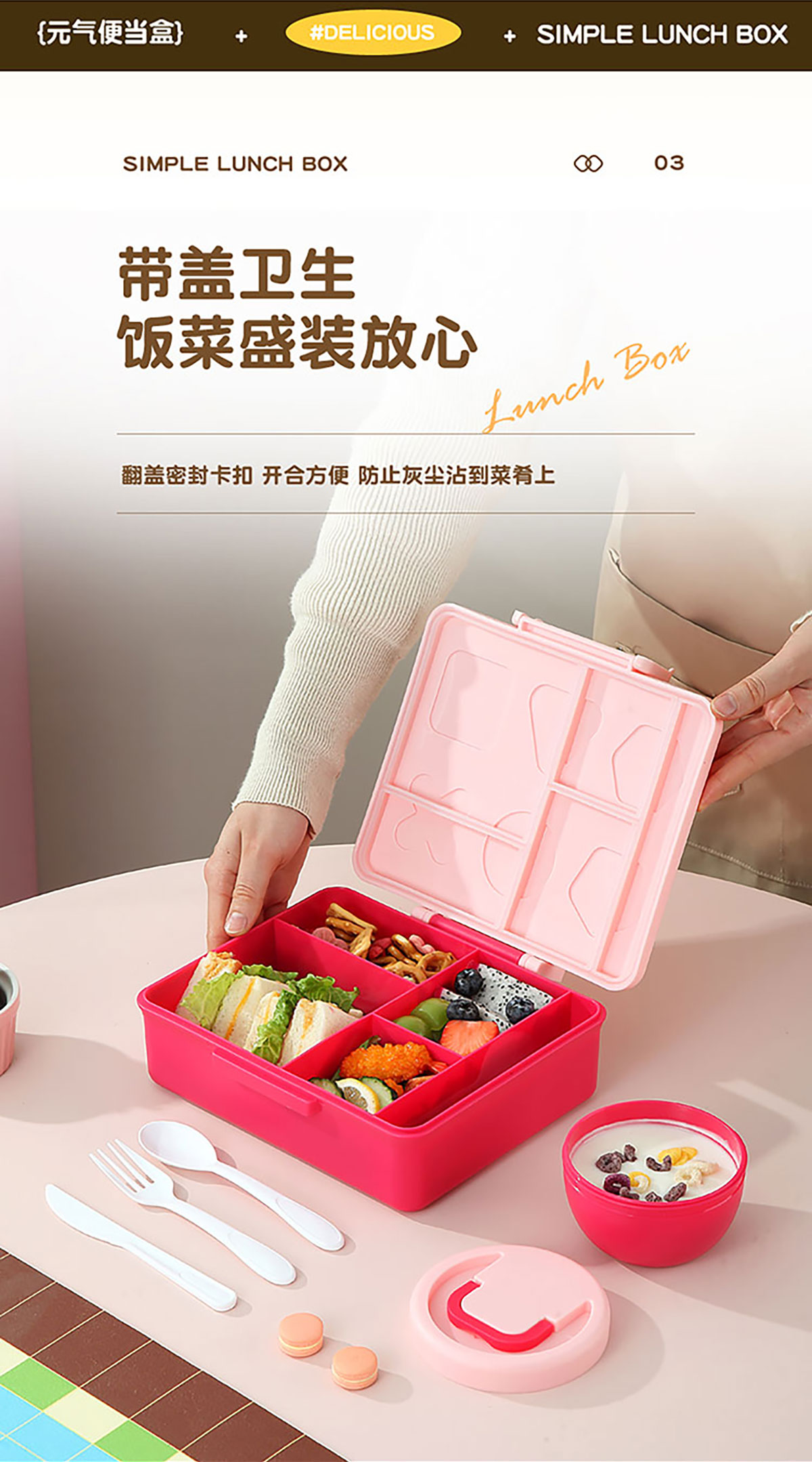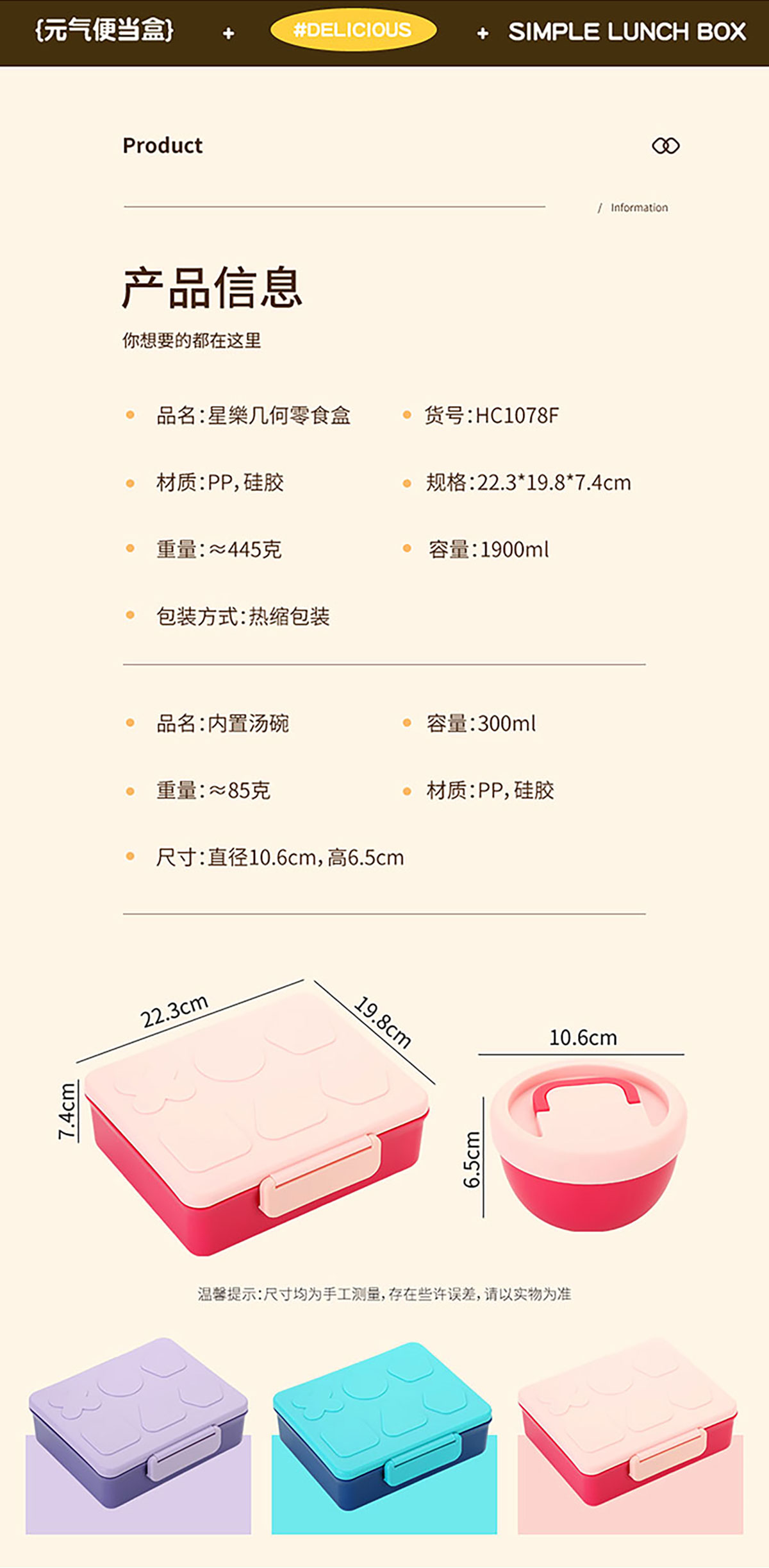Size: 饭盒:223*198*74mm/1900ml 汤碗:直径106*高65mm/300ml