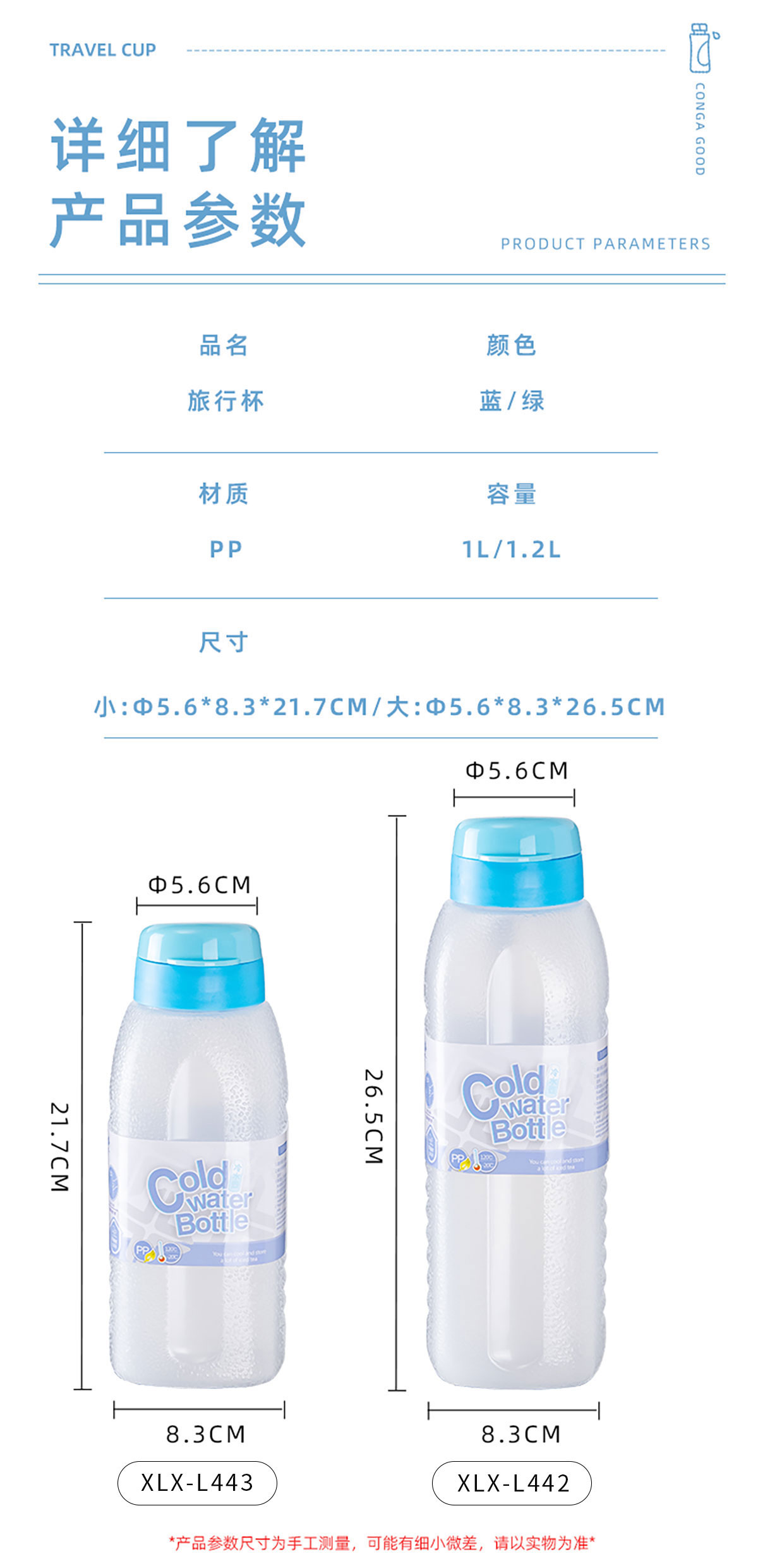 Size: XLX-L442(大号):Φ56*83*265mm/1.2L XLX-L443(小号):Φ56*83*217mm/1L